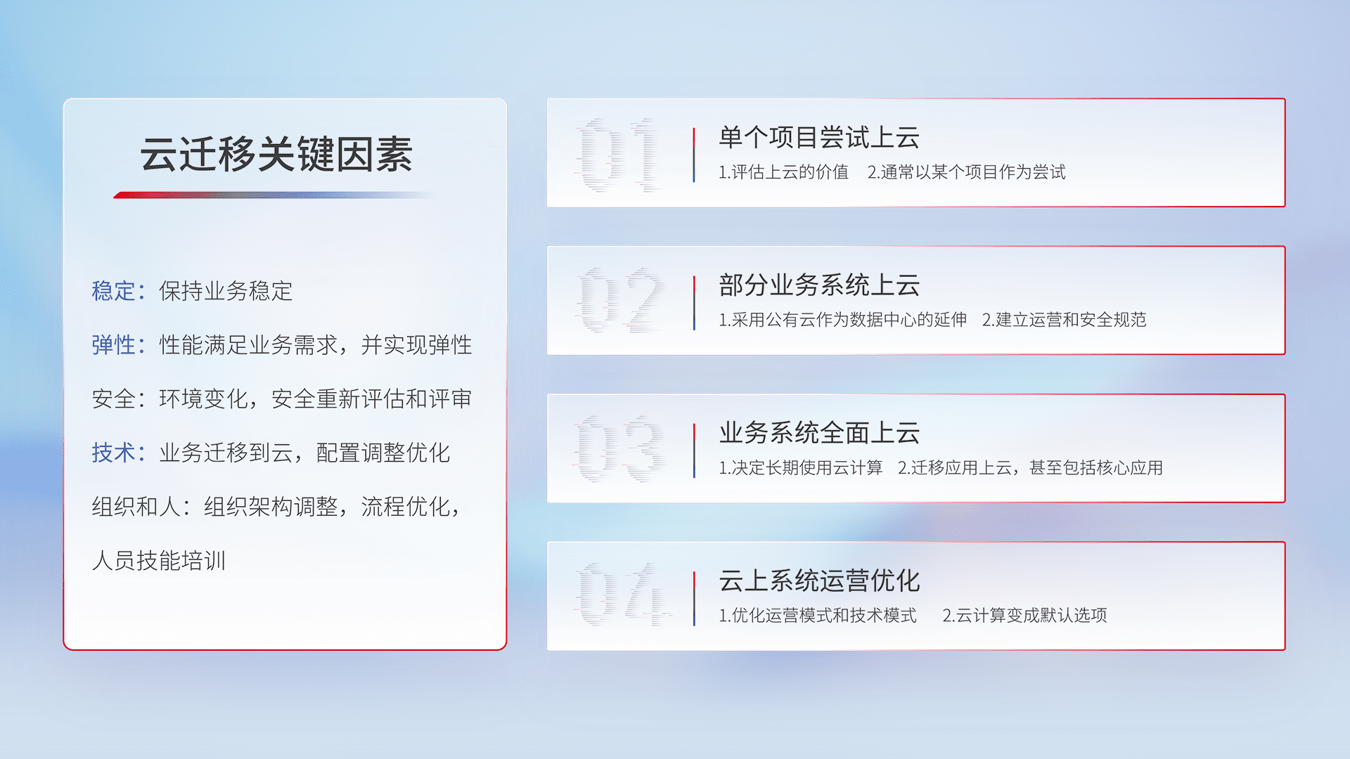 结合实际业务,,,从规划设计、、、云平台选型、、、、云原生改造、、、、数据迁移、、、集成交付,,迁移全过程为客户识别最佳上云路径,,,,做好风险识别管理,,,设计网络架构、、、、身份权限、、安全审计合规、、、操作审计、、、、日志审计、、监控告警策略、、、、多站点容灾设计等,,,对云上基础设施进行整体规划,,,,提升IT治理水平,,以满足弹性、、、高可用、、、、高性能的需求。。。。