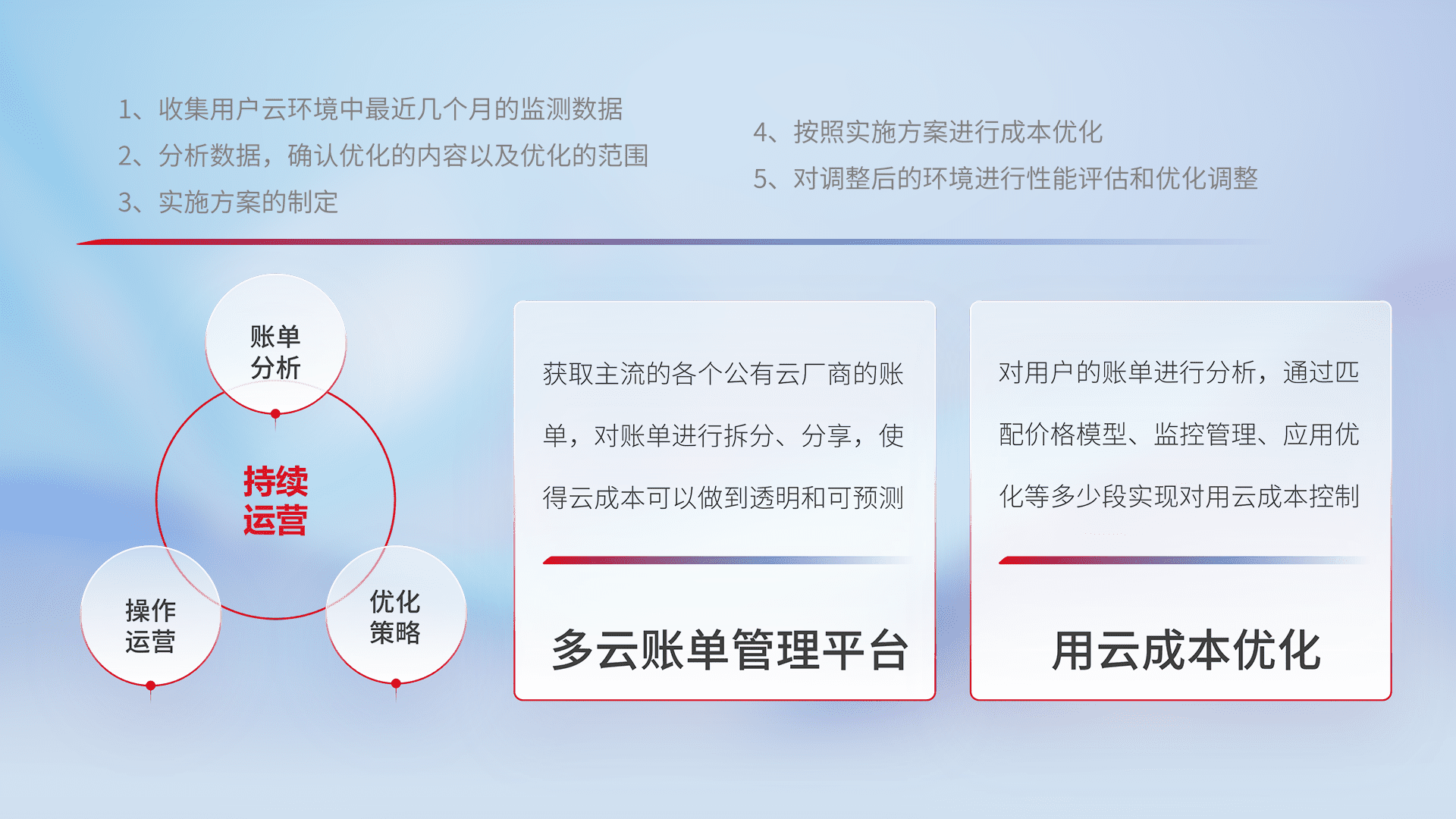 通过灵活运用多种自动化迁移工具,,,,帮助企业用户实现业务和数据高效 、、、稳定的上云迁移和云上迁移,,,,采用自研多云纳管平台,,,,以中立管理模式,,,解决多组织、、多云、、、多运维厂商的复杂关系的管理,,保证多云平台资源配置的一致性,,实时掌控云资源运行数据,,,运用智能化工具分析云资源多云平台的管理服务,,,透明化管理成本支出,,,用云成本可预测、、用云费用可优化、、、、云资源配额有据可依。。。。