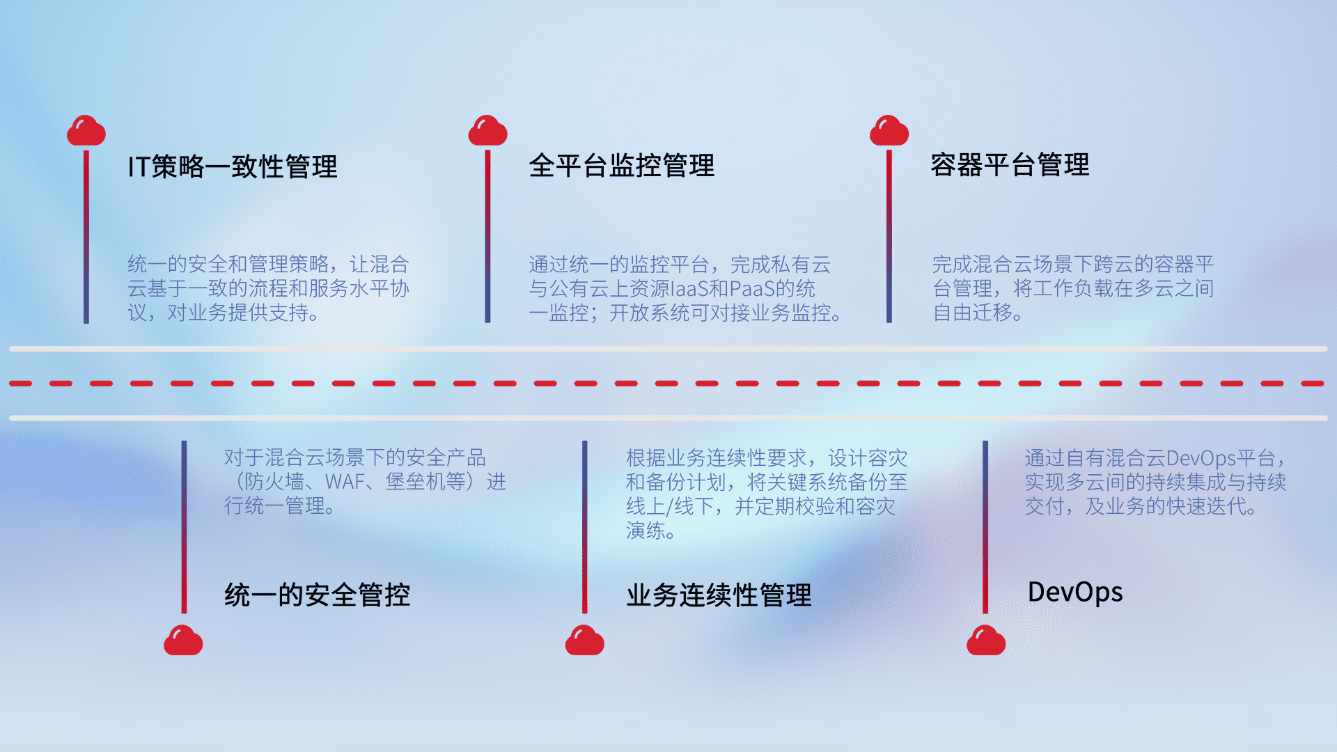 通过多云纳管,,以统一的资源数据模型把客户的云资源进行抽象和封装,,,,进而实现对多云资源的统一操作,,,,保障云资源管理的可靠性、、稳定性与可用性。。量身定制化运维内容,,,,配置、、、、开发运维、、、、补丁管理、、备份、、、监控、、、认证和访问管理、、、、审计和日常巡检等,,保障在用云过程中的可靠度,,,,稳定度以及高可用率。。